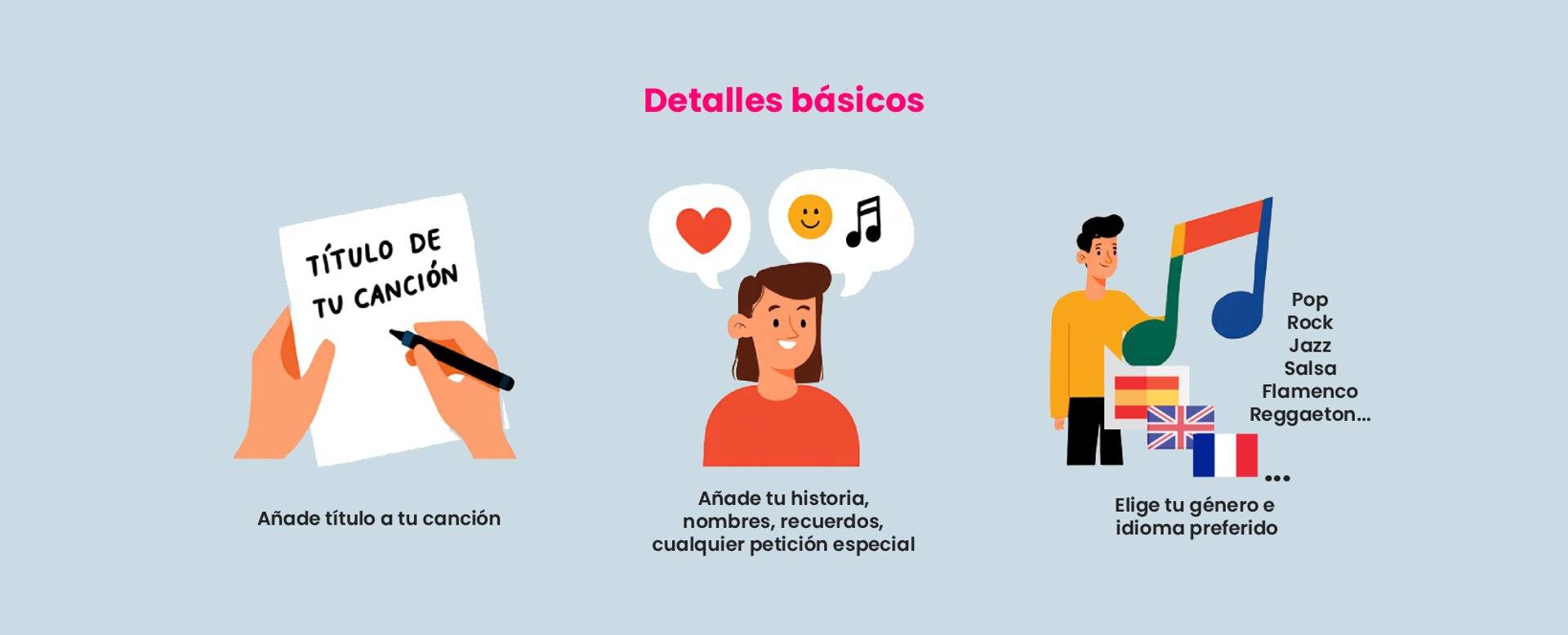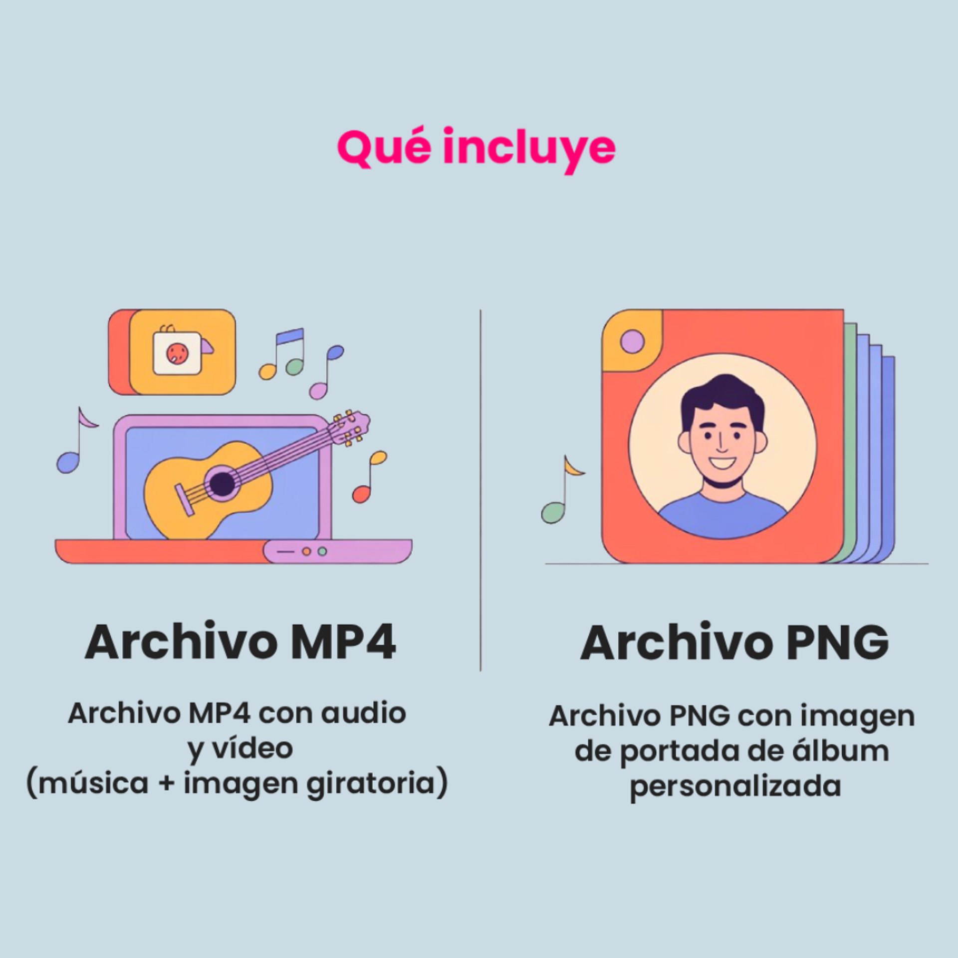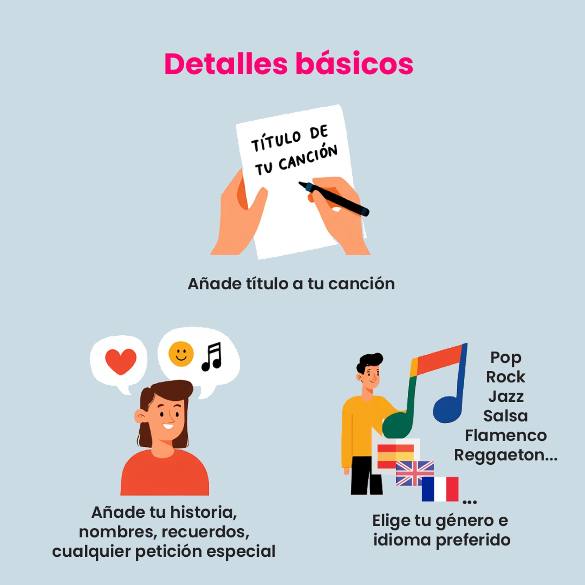 Cada canción se prepara con inteligencia artificial desde cero para capturar la esencia de tu relación o evento. Para que sea aún más especial, también recibirás una imagen de portada de álbum personalizada, para que tu música se sienta como un verdadero recuerdo.